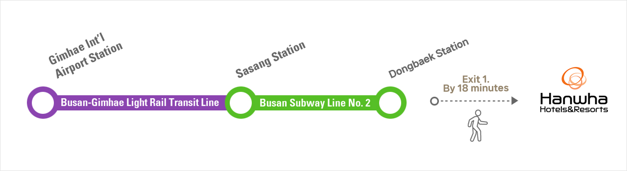 Busan Subway Line No. 2 | Sasang Station | Dongbaek Station | About 45 mins | KRW 1,800 | 4-15 mins |